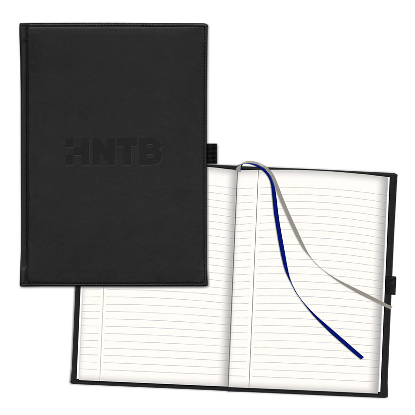 Smooth, padded, faux leather covers. Classy blind deboss imprint. 125 sheets of lined filler. Features quality, thread-sewn book binding, black elastic pen loop, and blue & silver satin ribbon bookmarks.